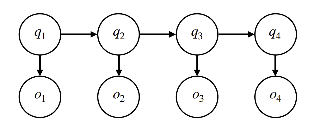 - 系统在每一个时刻 \(i\) 处于一个隐藏状态 \(q_i\),当前状态只与前一个状态相关;